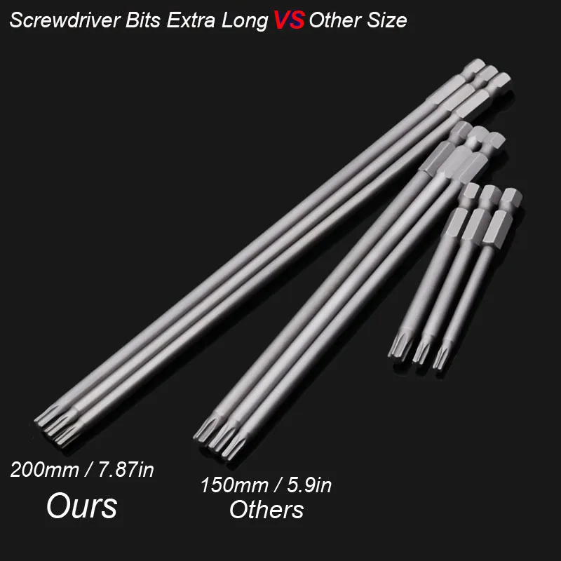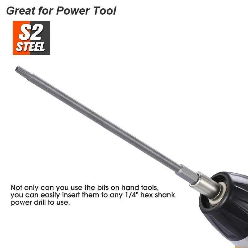Cet ensemble d’embouts Torx comprend une large gamme de tailles, allant de T8 à T40, ce qui les rend compétents pour différentes conditions de travail. Ils peuvent être utilisés dans de nombreuses applications telles que les réparations automobiles, les motos, les ordinateurs, les boîtes de câbles, les jouets, les appareils électroménagers, etc.