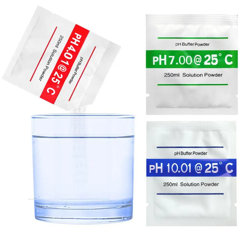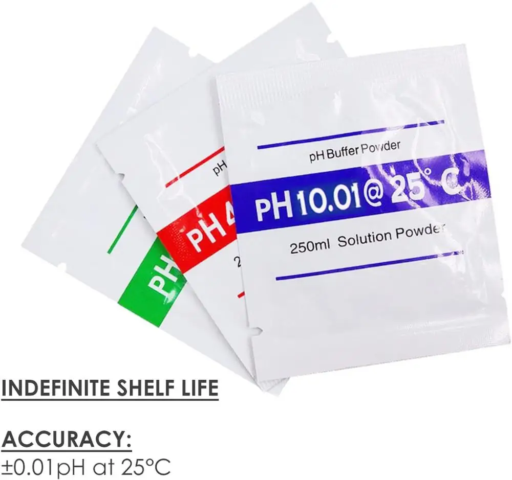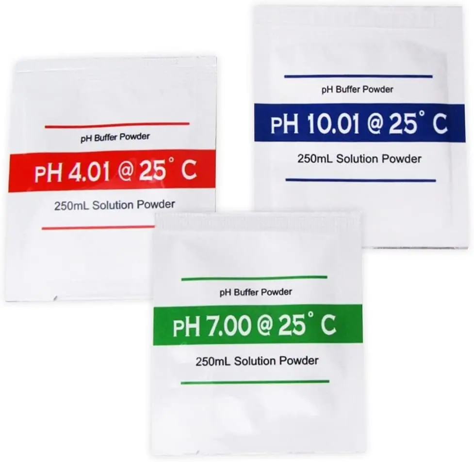 - 3 packs de solutions tampons de pH : pH 4.01, pH 7.00 et pH 10.01