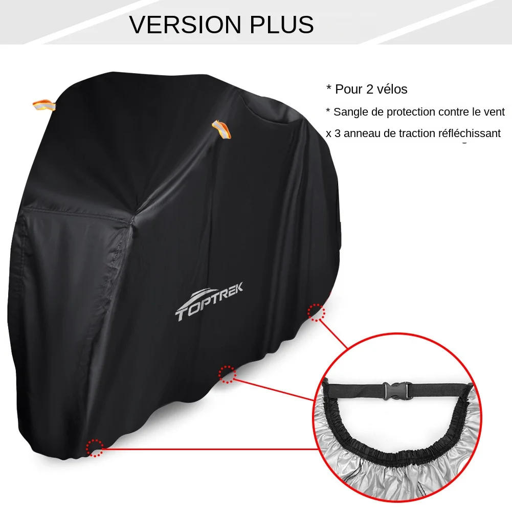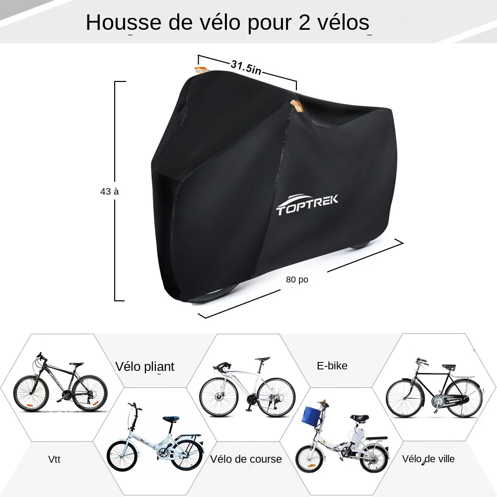 | Taille | La housse de vélo Toptrek peut couvrir deux vélos en même temps. Taille dépliée pour deux vélos : 205*110*80 cm. Taille pour un vélo : 200*110*70cm |
