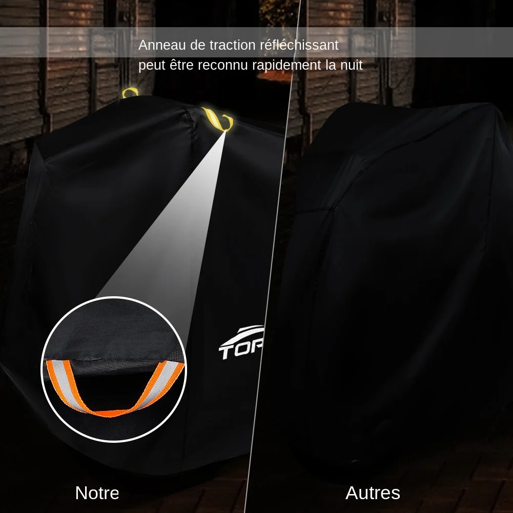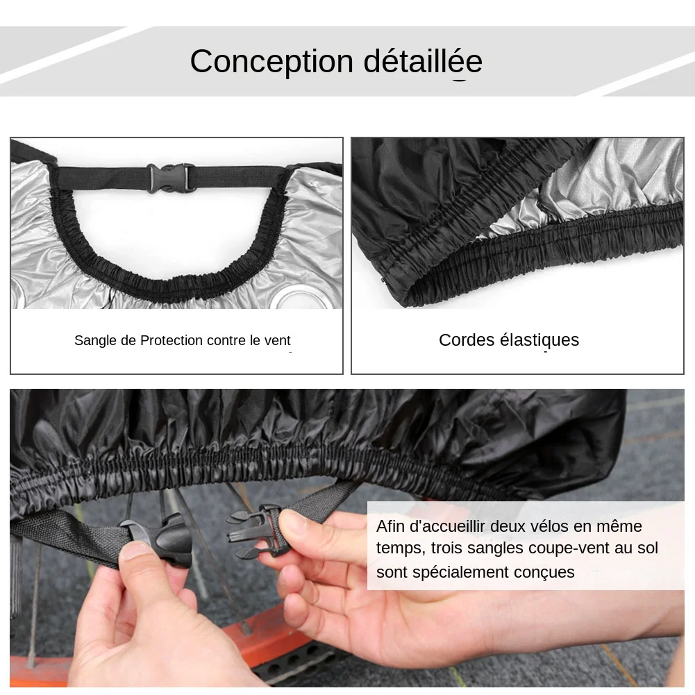| Design détaillé | La housse est équipée de trois sangles coupe-vent pour fixer la couverture de vélo au sol. Elle possède également une corde élastique en bas pour empêcher le vent. Un anneau de traction réfléchissant est placé sur le dessus pour faciliter l’utilisation de nuit. |