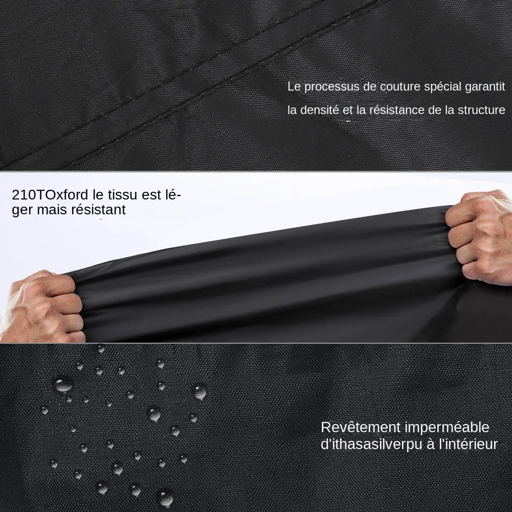 | Matériel | La couverture de vélo est fabriquée en tissu Oxford 210D de haute qualité. Elle est légère, solide et résistante. Elle est également imperméable et anti-UV grâce à son revêtement en argent PU. |