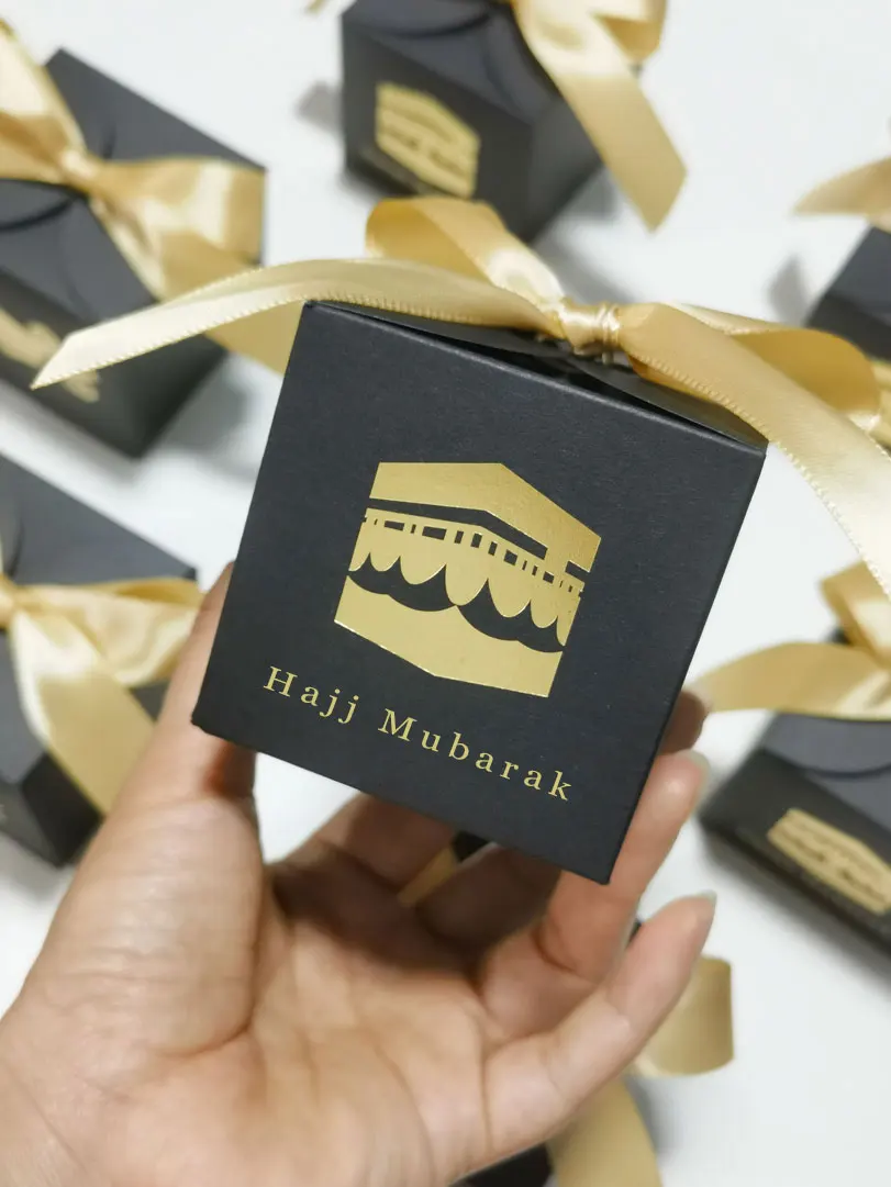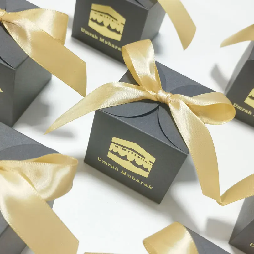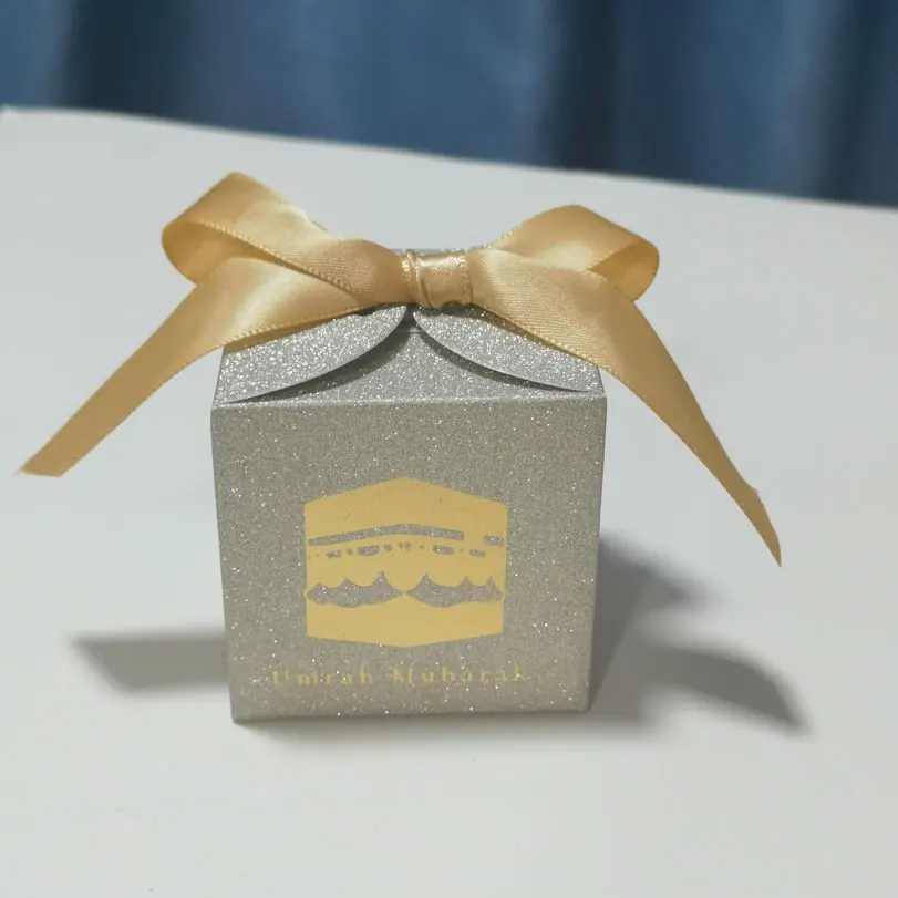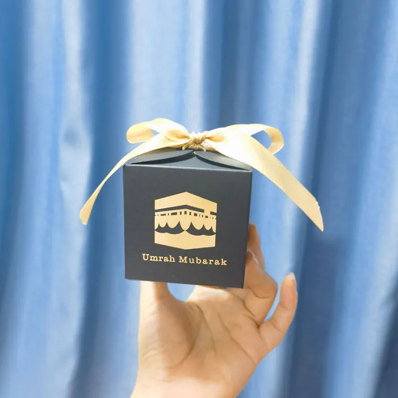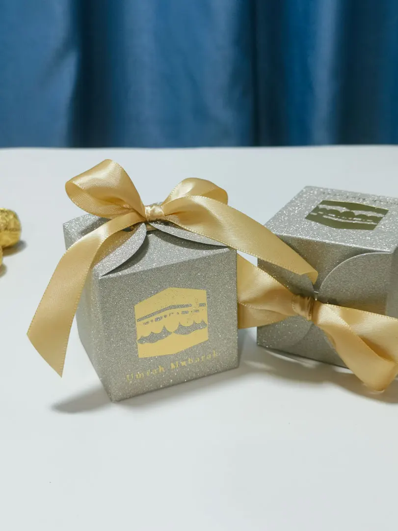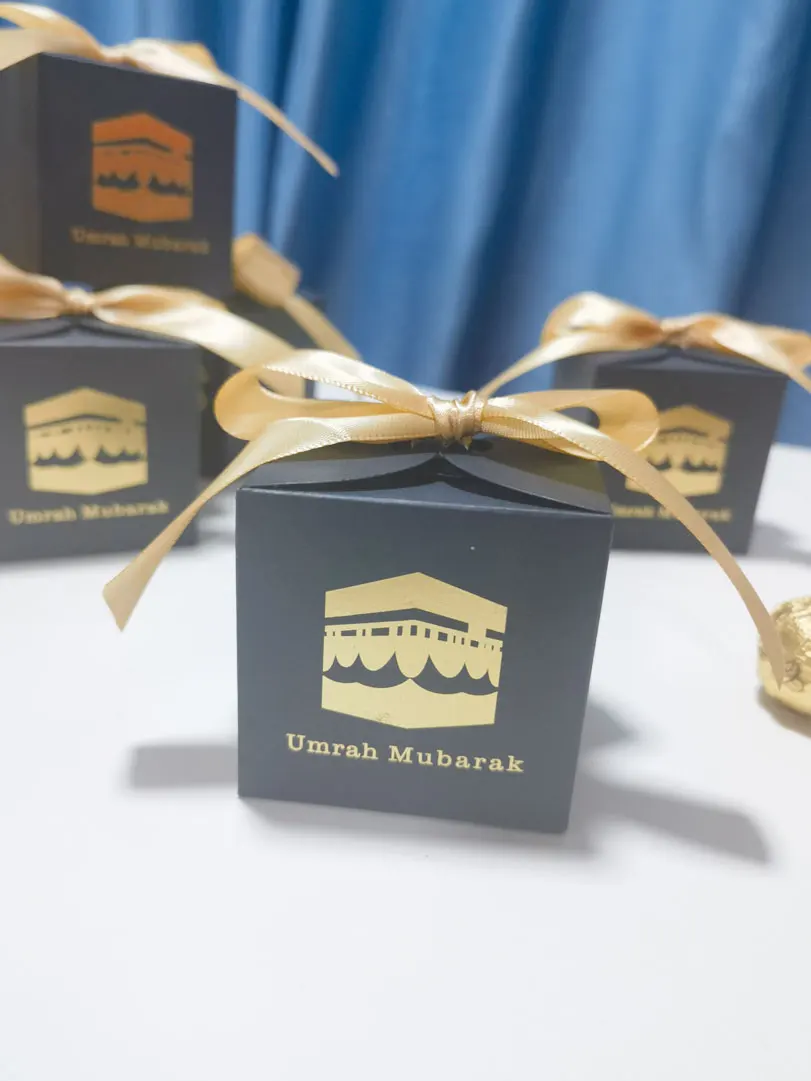 Voici notre avis sur la boîte à bonbons carrée Umrah Mubarak avec ruban, une fourniture de décoration idéale pour les musulmans lors de l’Aïd. Cette boîte mesure 6.5×6.5×6.56cm et est fabriquée en papier.