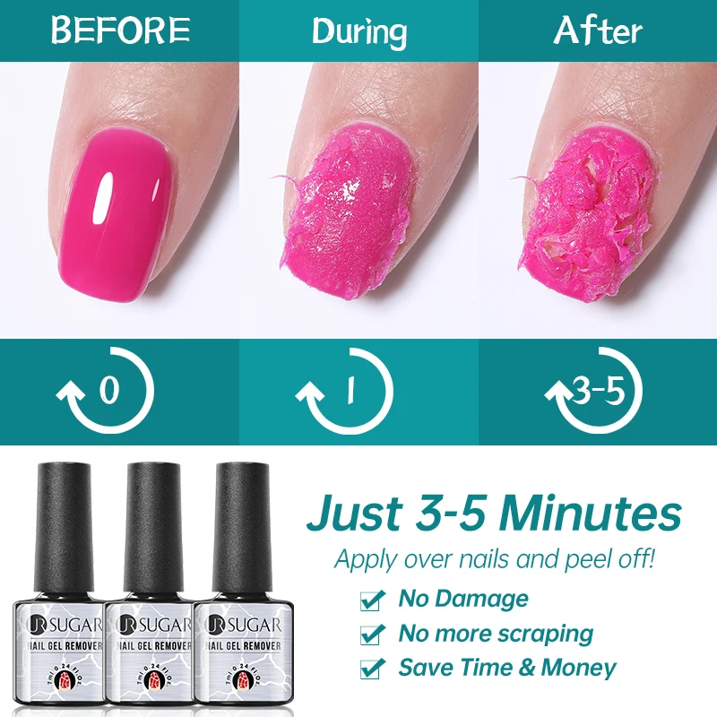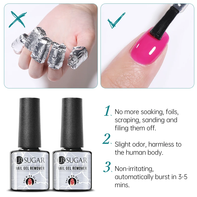 Le temps de retrait du vernis à ongles gel avec le dissolvant UR SUGAR est de 3 à 5 minutes.