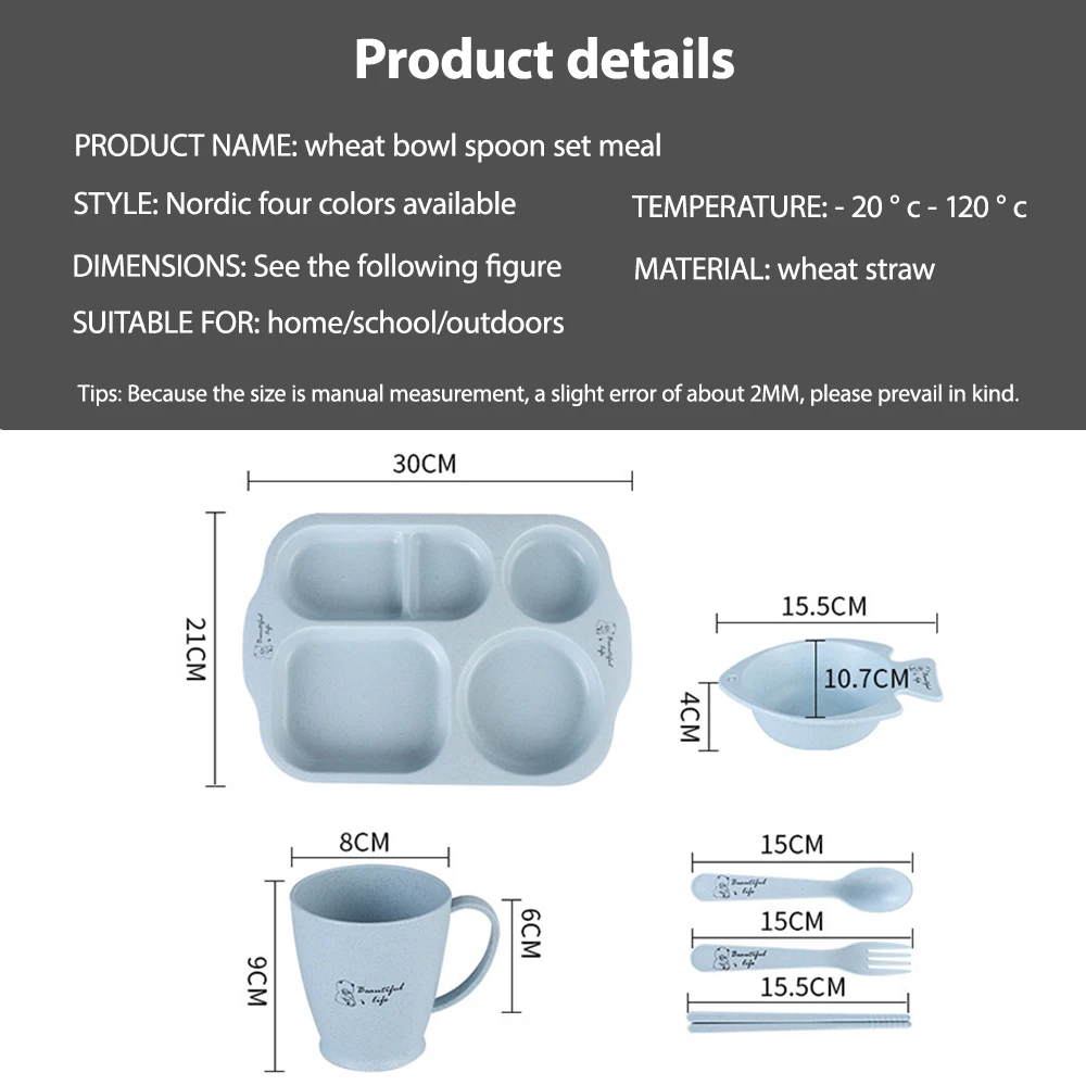 Cet ensemble de vaisselle pour enfants est fabriqué en paille de blé naturelle, ce qui le rend sain et écologique. Il est disponible en différentes couleurs : rose, vert, beige et bleu. Le set est composé de 6 pièces, dont une assiette à manger, une cuillère, une fourchette, des baguettes, un bol et une tasse. Sa taille est de 30*21*3.5 cm.