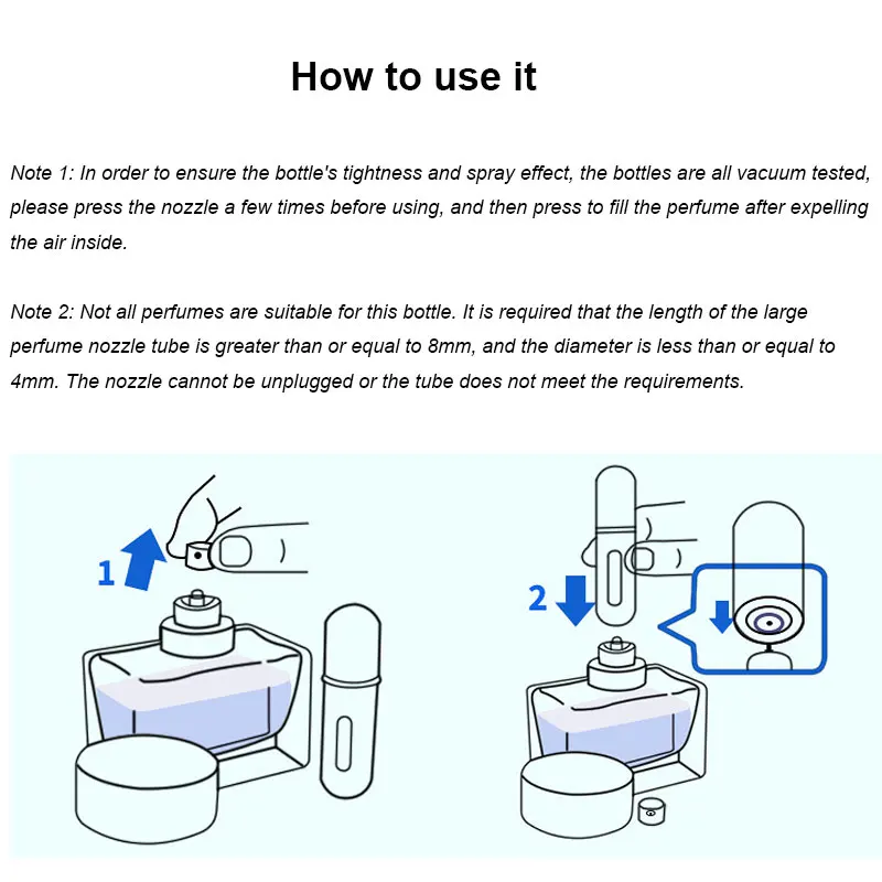 Remarque 1: Afin d’assurer l’étanchéité et l’effet de pulvérisation de la bouteille, les bouteilles sont toutes testées sous vide, veuillez appuyer plusieurs fois sur la buse avant de les utiliser, puis appuyez pour remplir le parfum après avoir expulsé l’air à l’intérieur.
