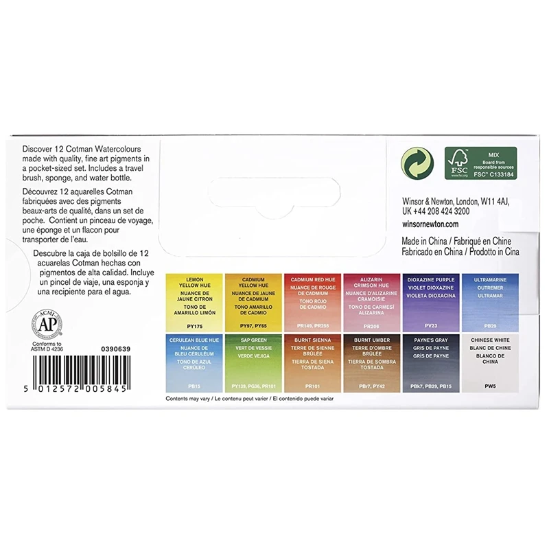 - Cet ensemble d’aquarelles contient 12 demi-godets Cotman Water Colour : teinte jaune cadmium pâle, teinte jaune cadmium, teinte rouge cadmium pâle, teinte pourpre alizarine, outremer, teinte bleu cobalt, teinte viridienne, vert Sève, Ocre Jaune, Sienne Brûlée, Ombre Brûlée, Blanc Chinois.